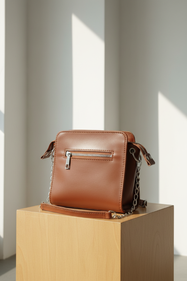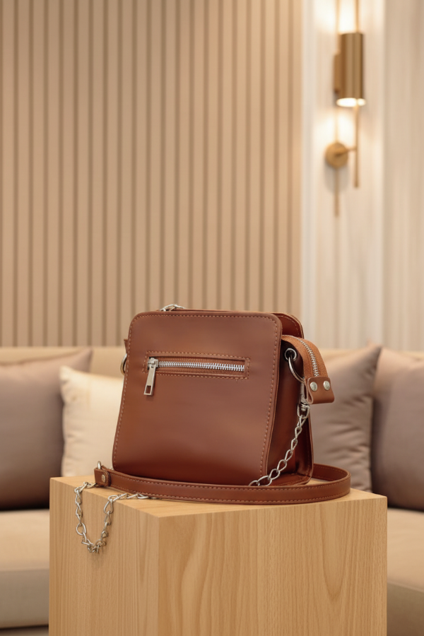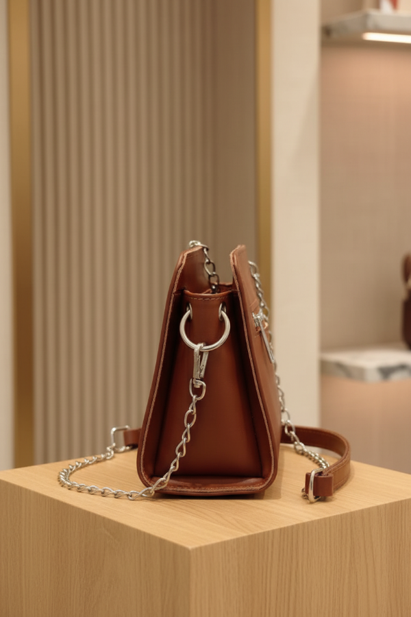 Esta cartera combina sofisticación atemporal con funcionalidad moderna. Su tono neutro en cuero suela y los detalles en cadena plateada la convierten en el complemento perfecto para quienes buscan un accesorio que aporte distinción sin perder practicidad.