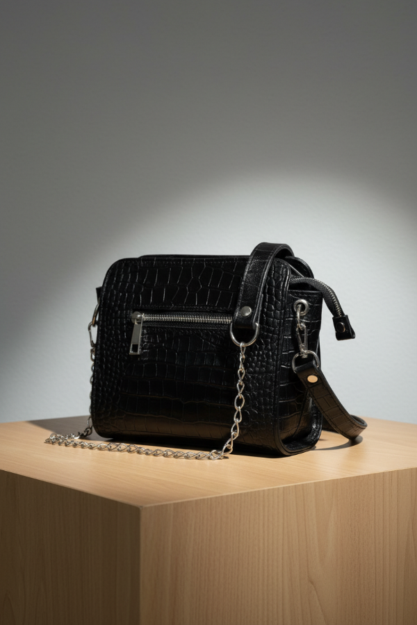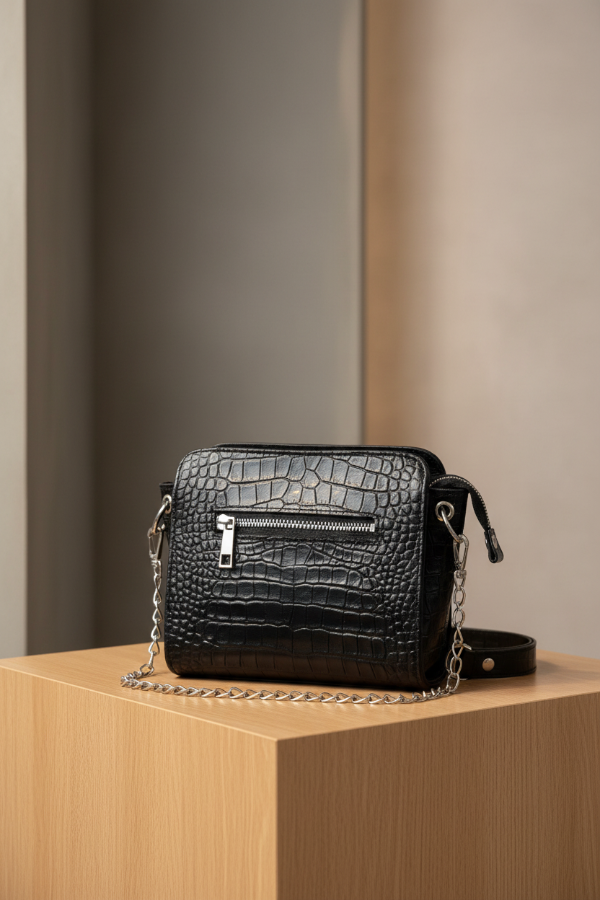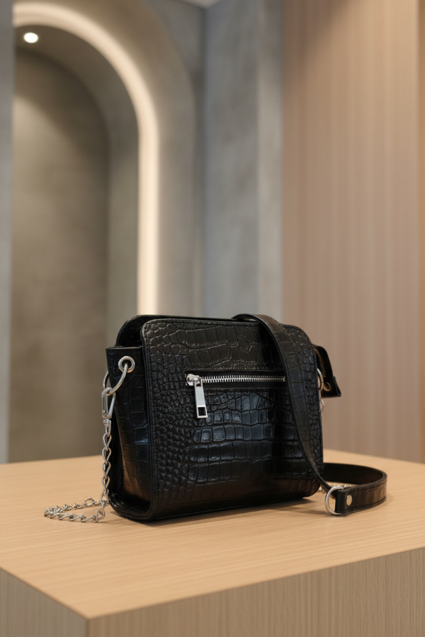 Esta cartera combina sofisticación atemporal con funcionalidad moderna. Su tono brillante en cuero labrado croco y los detalles en cadena plateada la convierten en el complemento perfecto para quienes buscan un accesorio que aporte distinción sin perder practicidad.