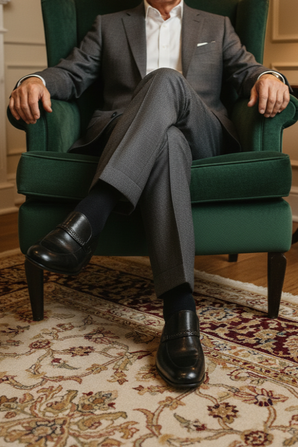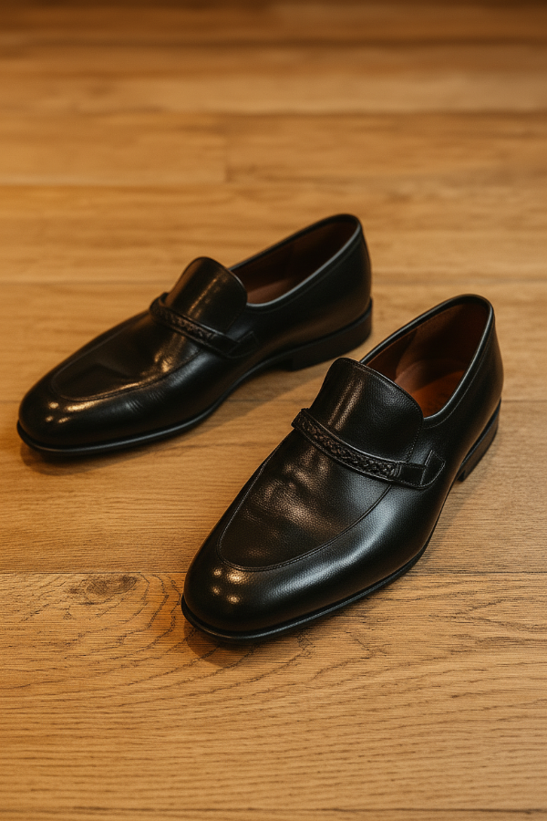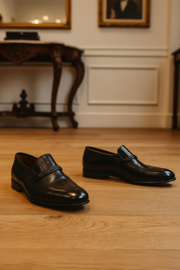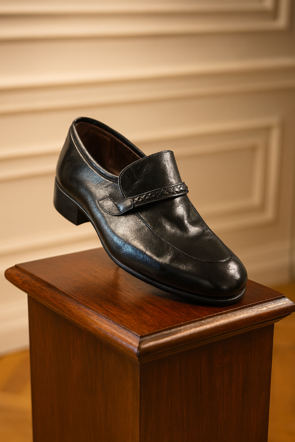 El zapato clásico de punta redondeada Aidel art 5090 es un calzado de vestir de cuero negro de cabretilla con acabado pulido y base de suela. Fabricado con costuras decorativas visibles y diseño clásico con tira de cuero trenzado atravesando el empeine creando un elemento distintivo elegante, es un calzado que brinda elegancia y estilo, con la calidad de materiales y terminaciones de Aidel.