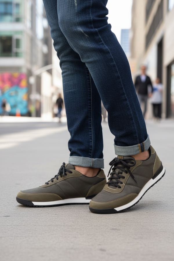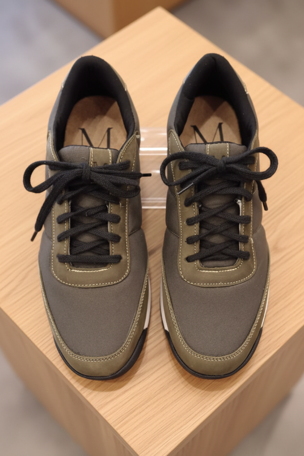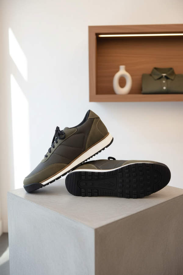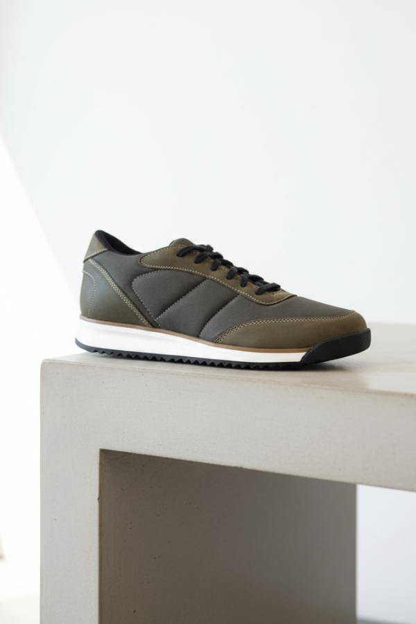 La Mocassino Safari es una zapatilla urbana con un diseño moderno y versátil, que presenta una combinación de cuero engrasado en verde musgo/militar y tela verde grisáceo. Tiene un calce suave que garantiza confort durante todo el día para un look casual con estilo.