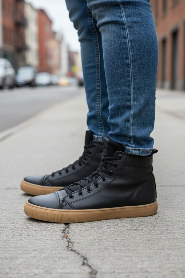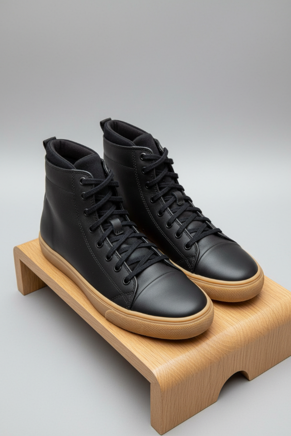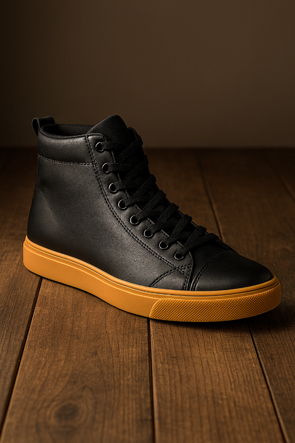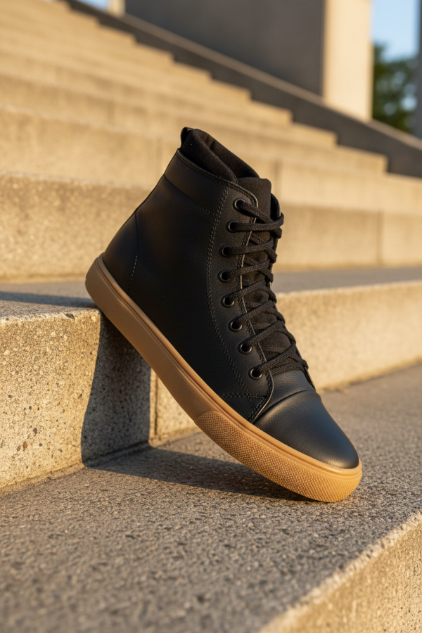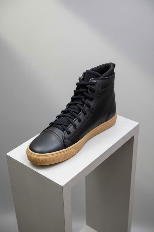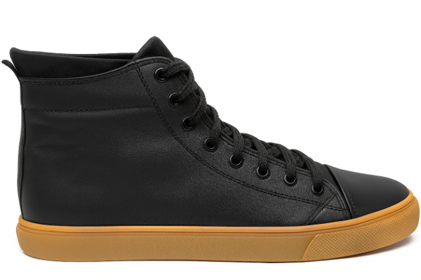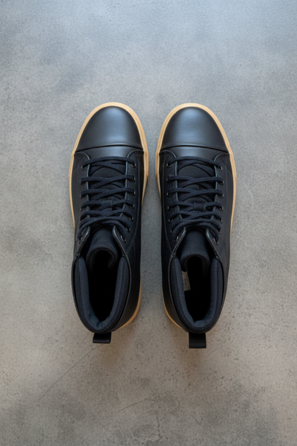 La botineta tipo sneaker de caña alta Mocassino Teo Soft de cuero negro liso suave, con ojales a tono que suben por toda la caña, cuello acolchado, lengüeta de tiro en el talón trasero para un calce más práctico, área de puntera reforzada y suela beige texturizada, es un calzado ideal para uso urbano casual sin resignar comodidad.