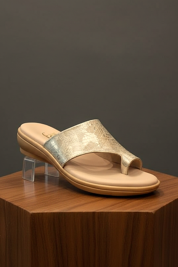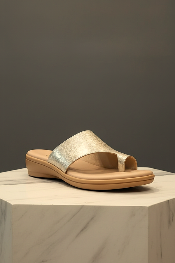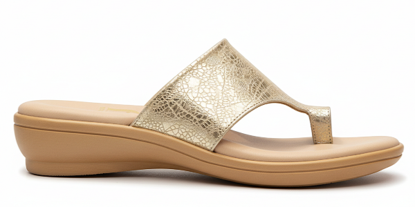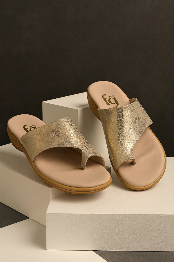 Gina Ferrari en su art 110 nos presenta estas elegantes ojotas de cuero genuino metalizado dorado y texturas grabadas que aportan estilo a cada paso, mientras que la plantilla acolchada ofrece confort durante todo el día. Su base baja de goma proporciona una altura sutil y estiliza la figura sin sacrificar estabilidad. Perfectas para combinar con looks casuales o de playa, estas ojotas fusionan diseño con funcionalidad, convirtiéndose en el complemento ideal para la temporada cálida.