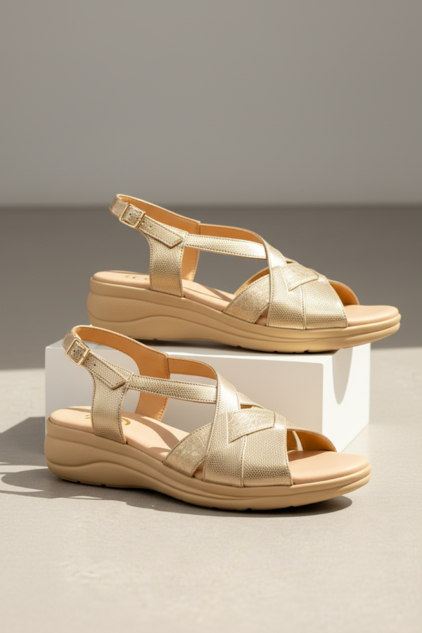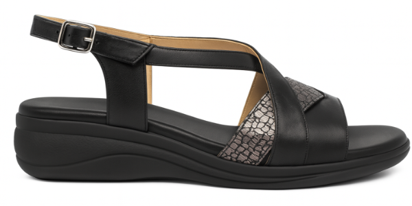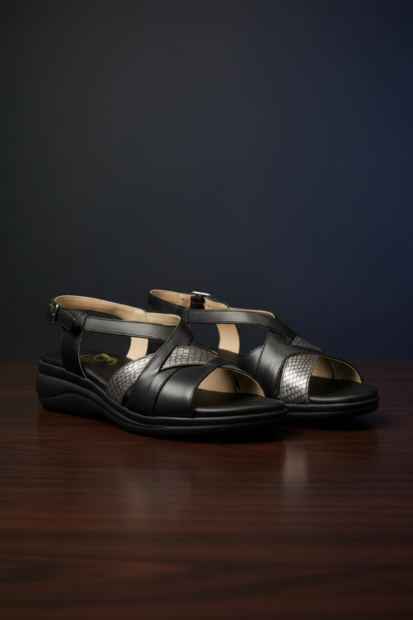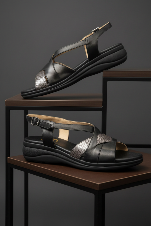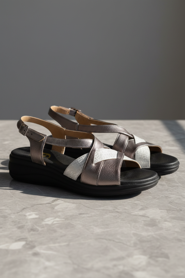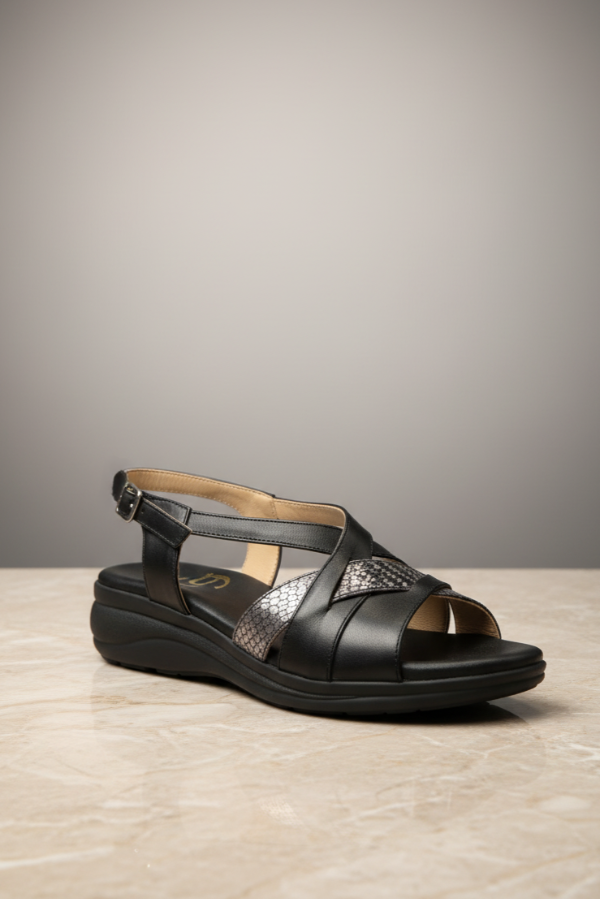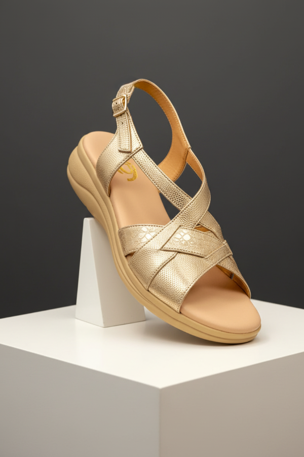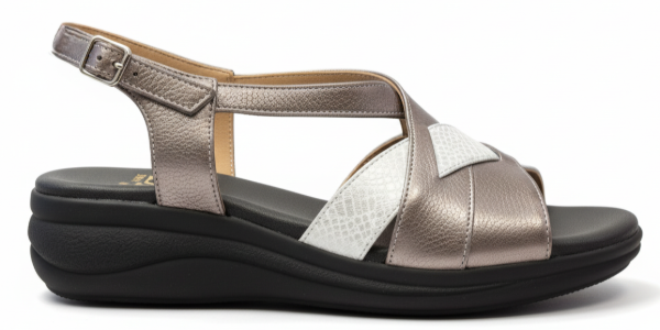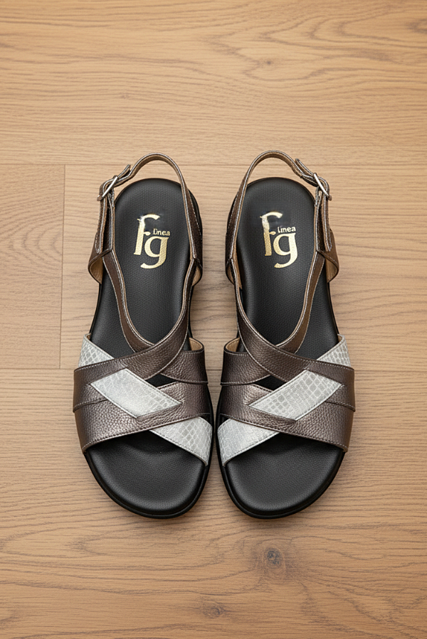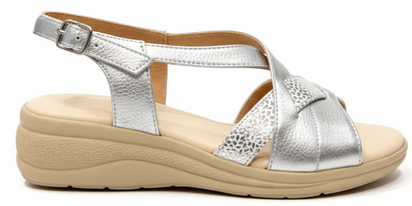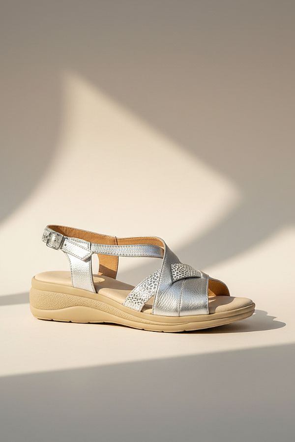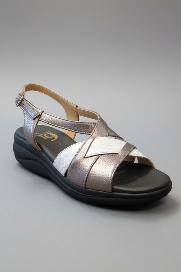 Esta sandalia Gina Ferrari art 13 tiene un diseño de tiras cruzadas a través del empeine creando un elegante patrón sobre el área de punta abierta con el cuero texturizado y correa ajustable al tobillo con hebilla. Su base con altura moderada y su plantilla anatómica brindan confort, sin resignar elegancia y estilo.