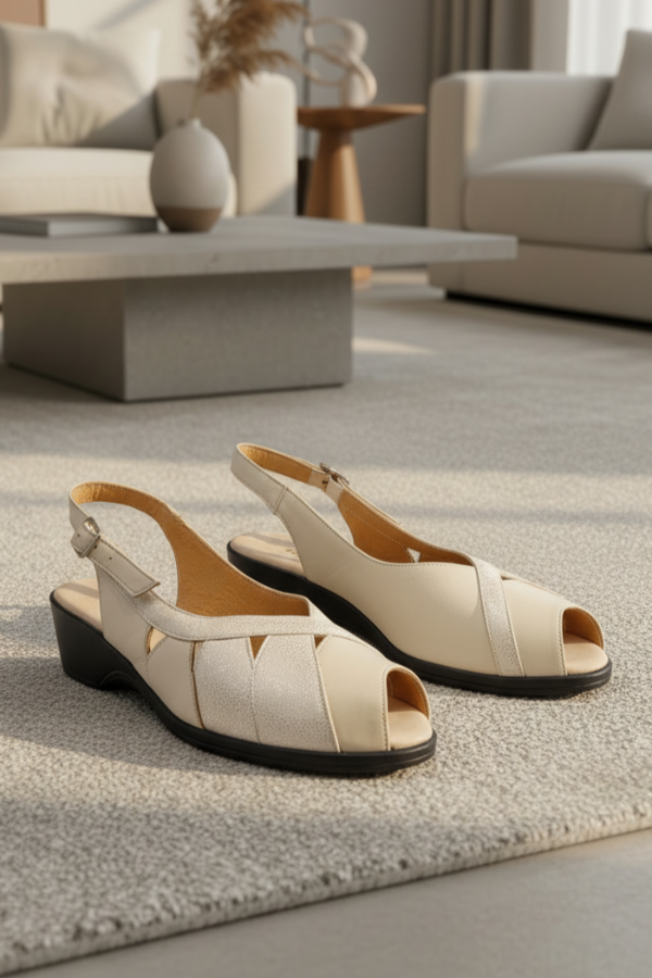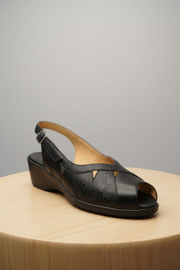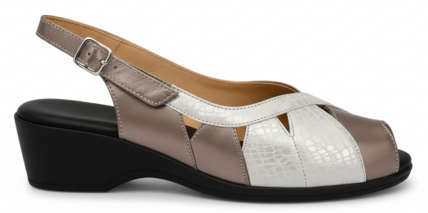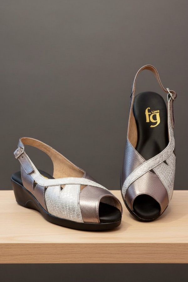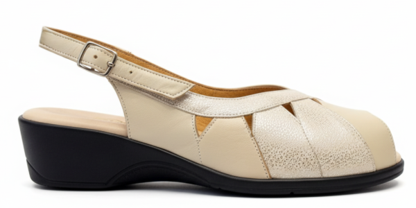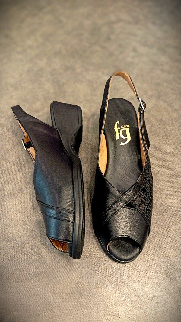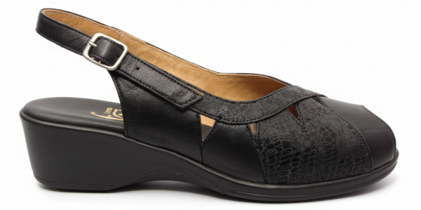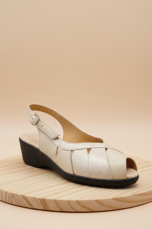 El art 454 de Gina Ferrari es un calzado confeccionado en cuero genuino con acabado texturizado sutil, formando un elegante patrón a través del empeine con detalles decorativos de recortes triangulares, mostrando una abertura en su punta, base en negro con altura moderada, plantilla anatómica y forro interior de cuero. Es un calzado de capellada baja, ideal para empeine alto fusionando diseño, elegancia y confort para primavera-verano.