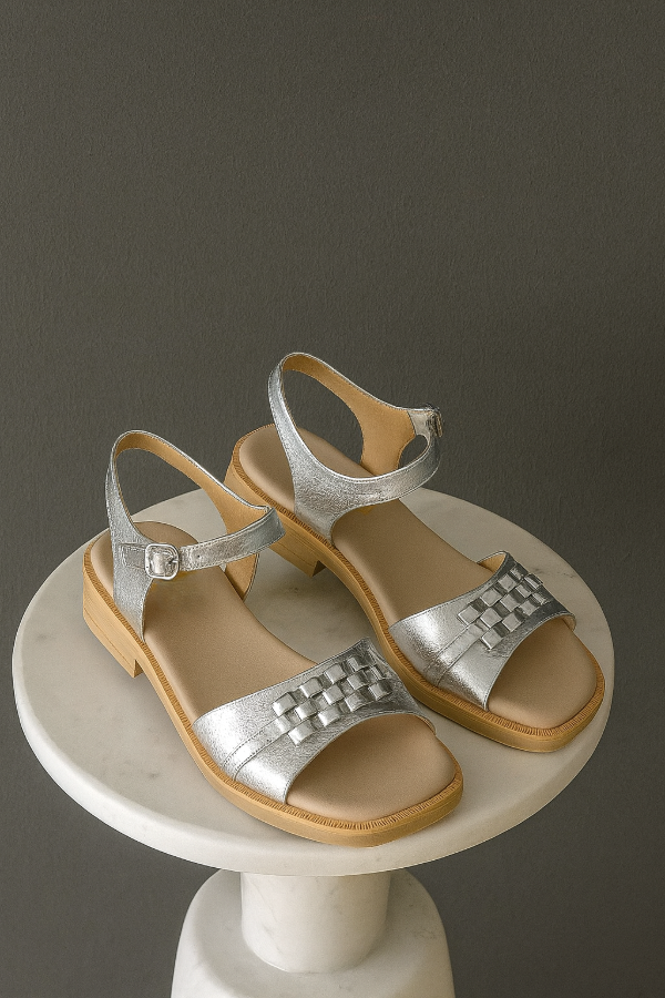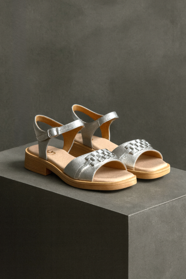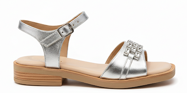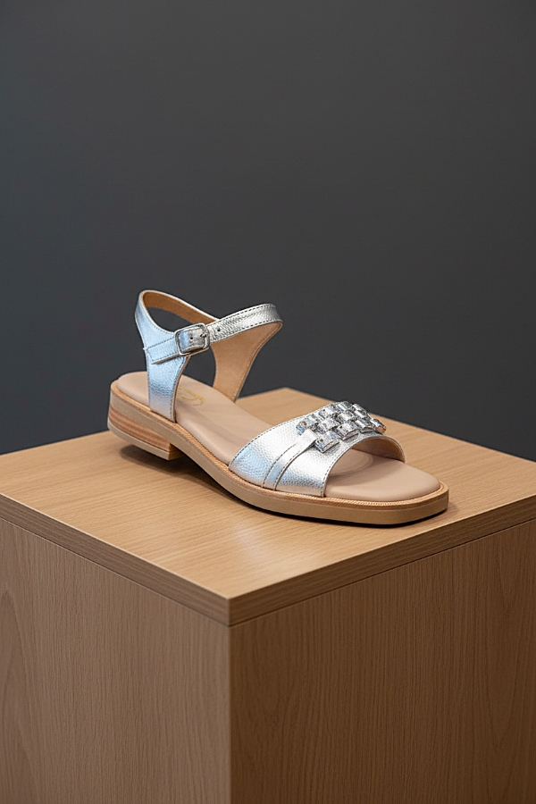 El art 7017 de Gina Ferrari es una Sandalia de taco bajo en cuero genuino metalizado plateado con apliques en relieve que aportan elegancia y distinción. Pulsera ajustable con hebilla al tobillo y plantilla acolchada para confort durante todo el día. Diseño versátil ideal para ocasiones especiales o looks sofisticados de verano.